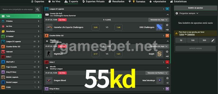 O 55kd oferece uma grande seleção de opções de apostas em e-sports com probabilidades competitivas